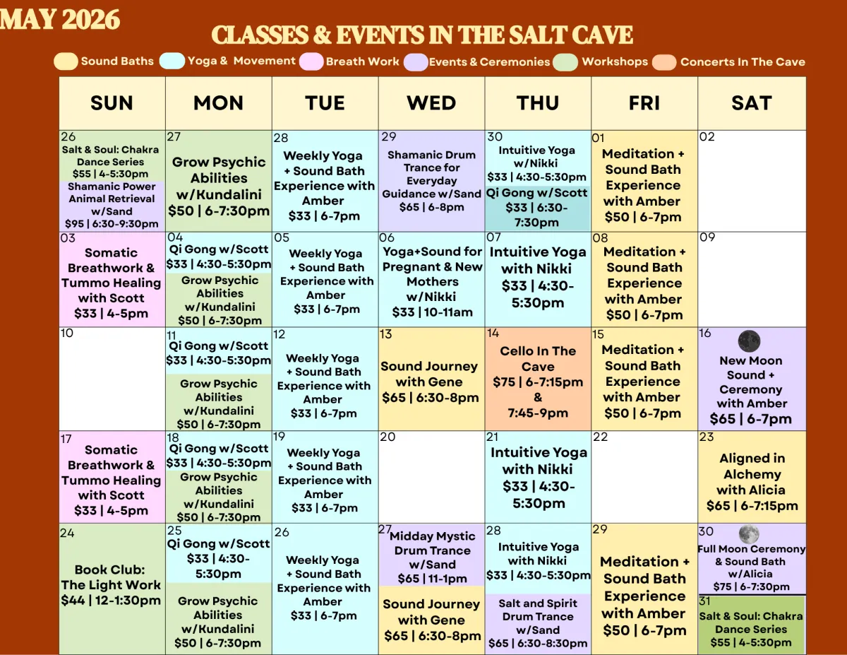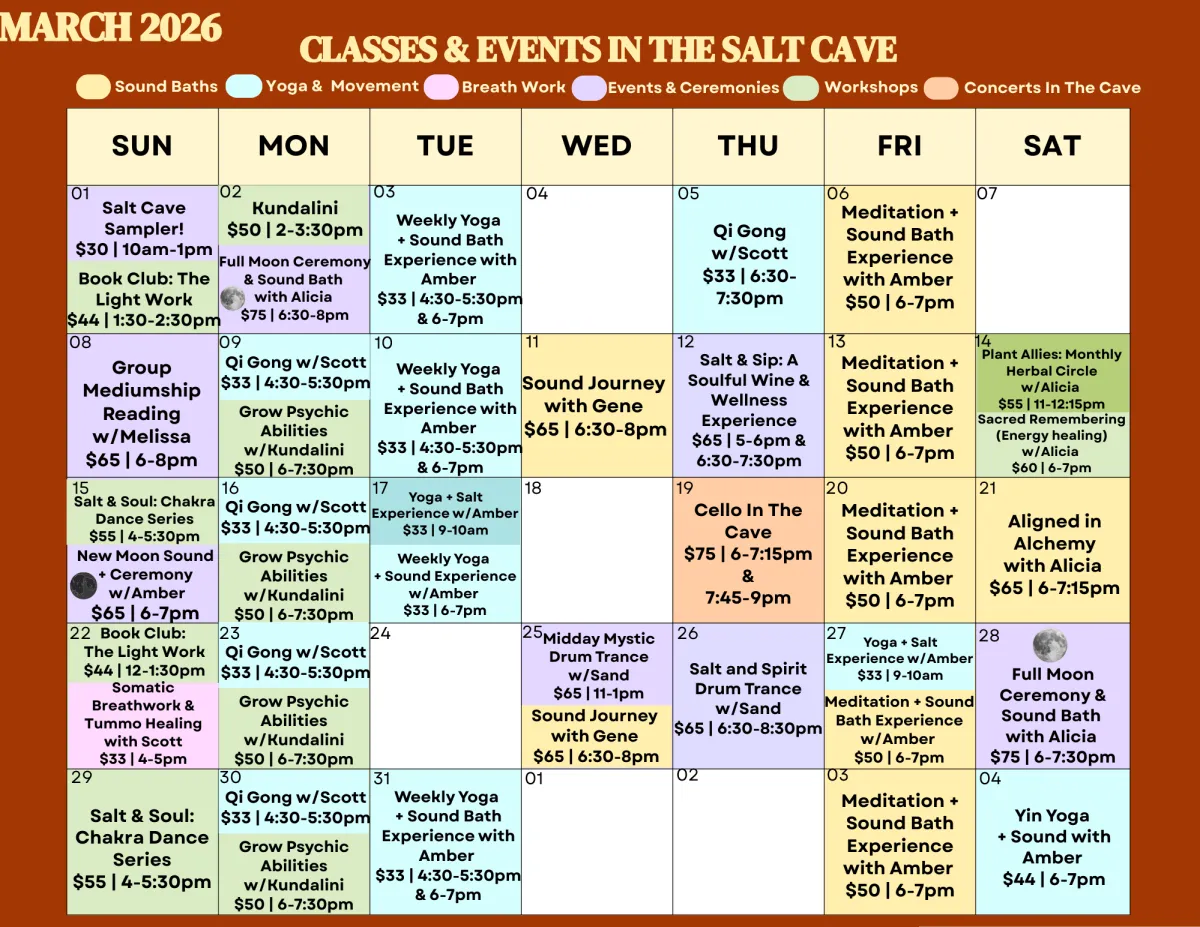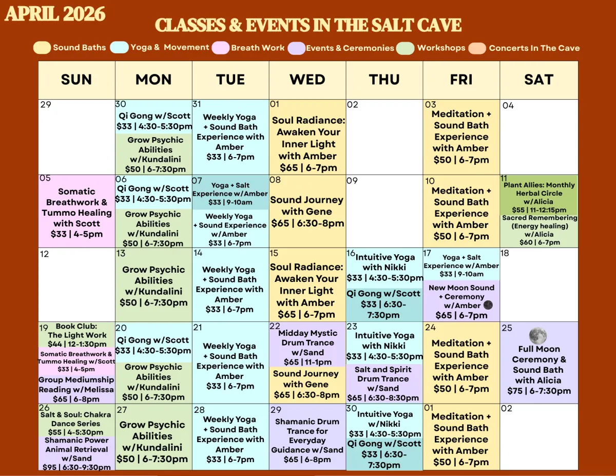 Unique and transformational workshops, classes, meetings & much more! All held in the serene space of our Community Salt Cave.