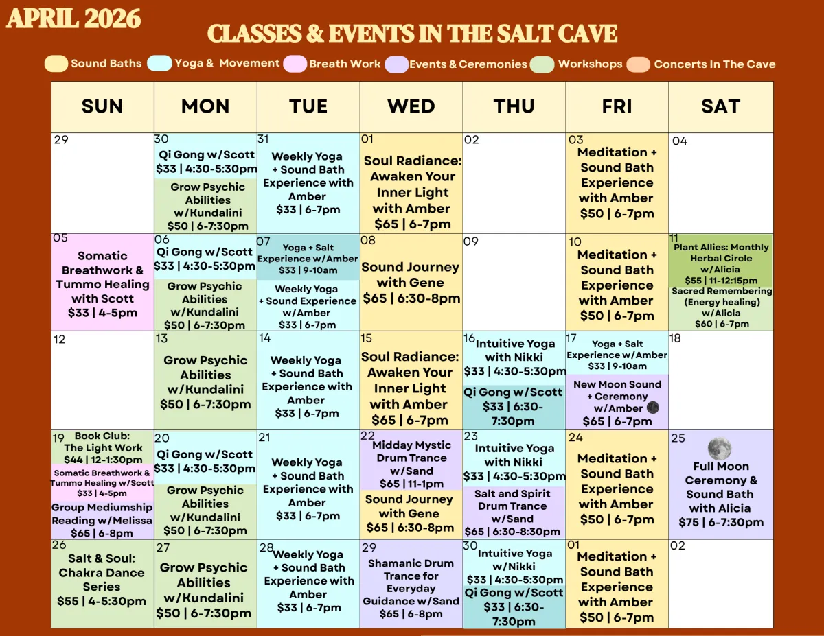 Unique and transformational workshops, classes, meetings & much more! All held in the serene space of our Community Salt Cave.